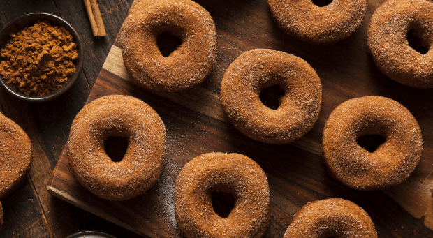 - Once the doughnuts are cool enough to handle, dip them in the melted coconut oil, then roll them in the cinnamon-sugar mixture.