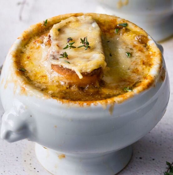 Place oven safe bowls, or large soufflé ramekins on the rimmed baking sheet, add 1/2 teaspoon of sherry to the bottom of each, and ladle soup on top. Top each serving of soup with garlic-rubbed toast. Divide cheese among the bowls, covering the bread and some of the soup.