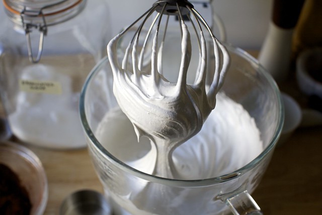Drizzle the hot sugar mixture in a slow and steady stream down the inside of the standings mixer bowl onto the gelatin. Once the entire mixture is in, increase the speed to high, add flavoring and continue to whip for approximately 10 to 12 minutes until thick, white, and tripled in volume.