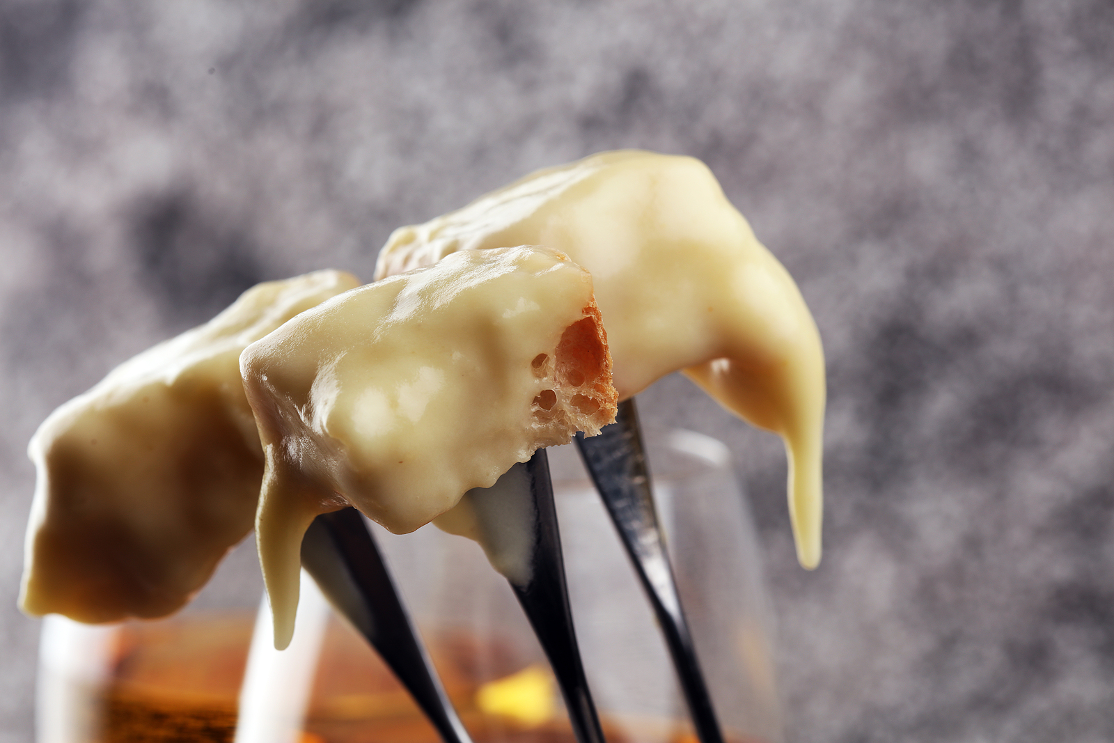 Drool! Fragrant melted cheese served in a communal pot, or a traditional caquelon or fondue pot over a little réchaud brought to temperature with a candle or various other types of flambe material. Small-bit-sized foods are consumed by dipping bread, assorted vegetables, and proteins dunked right into the warm, mouth-watering melted cheese using long-stemmed pronged forks.